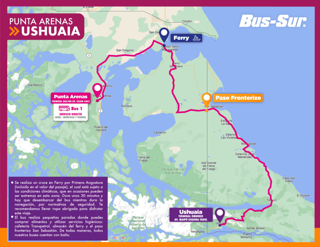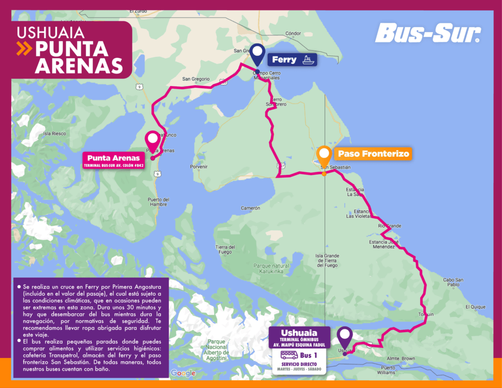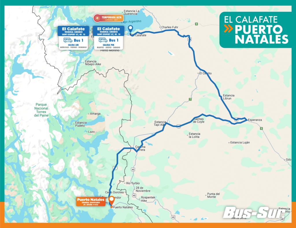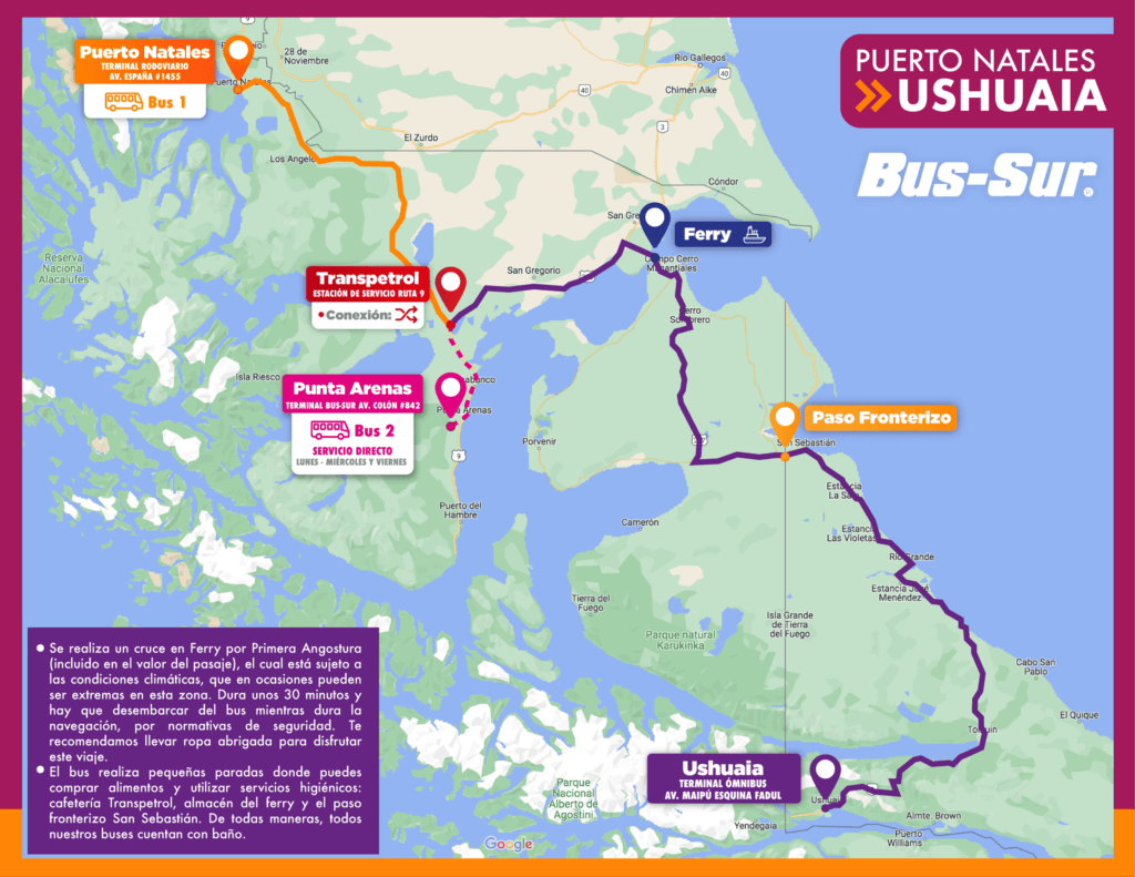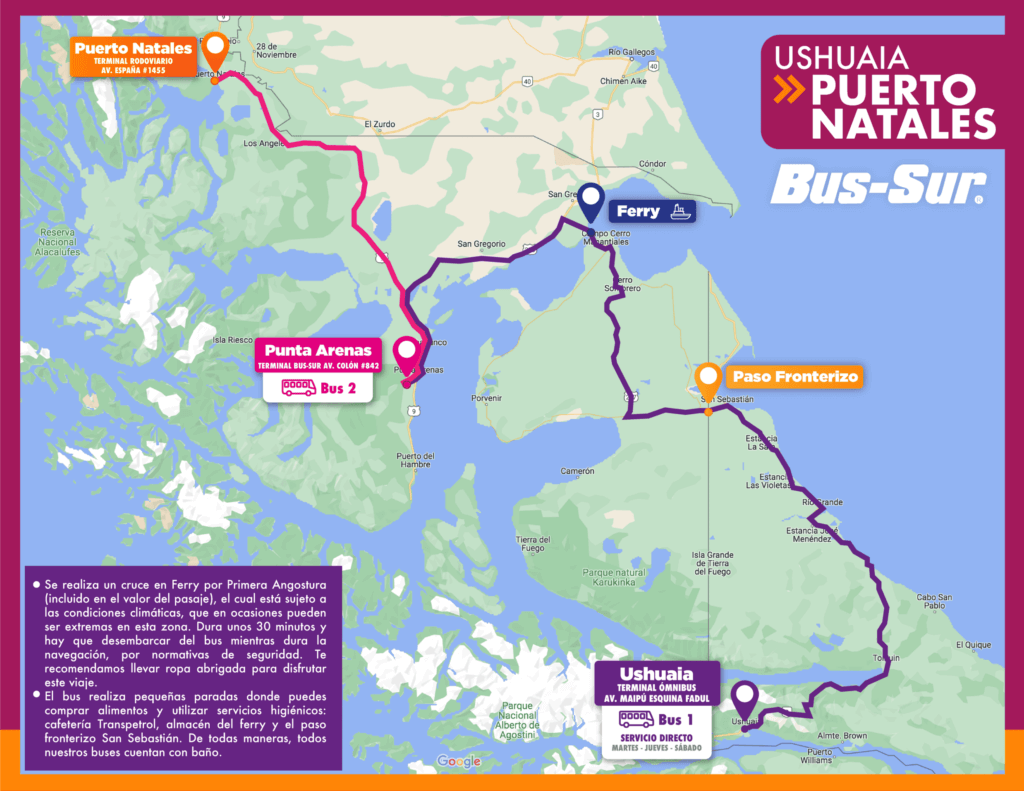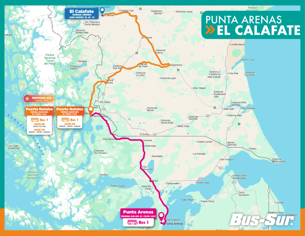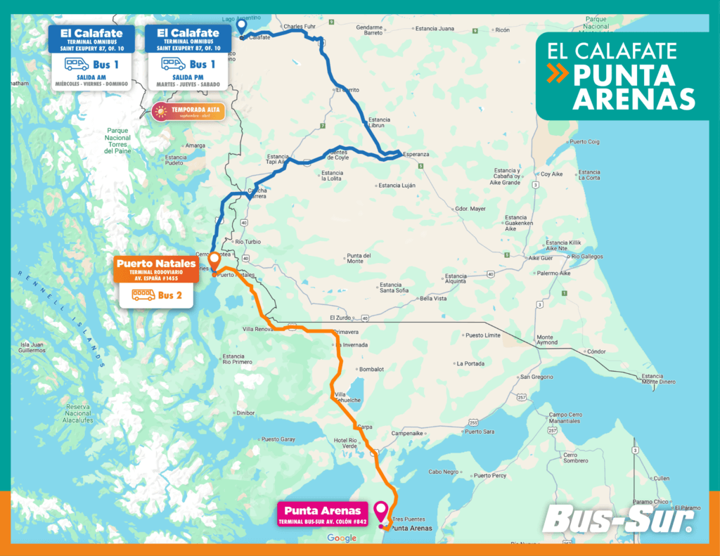 *Conexión hacia Puerto Natales se realiza en Terminal Bus-Sur de Punta Arenas, Av. Colón #842
