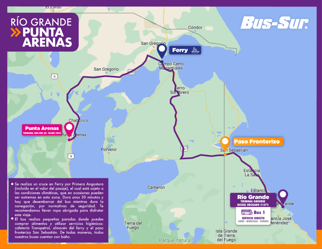 Para llegar a Río Grande desde Puerto Natales, debe utilizar dos buses: