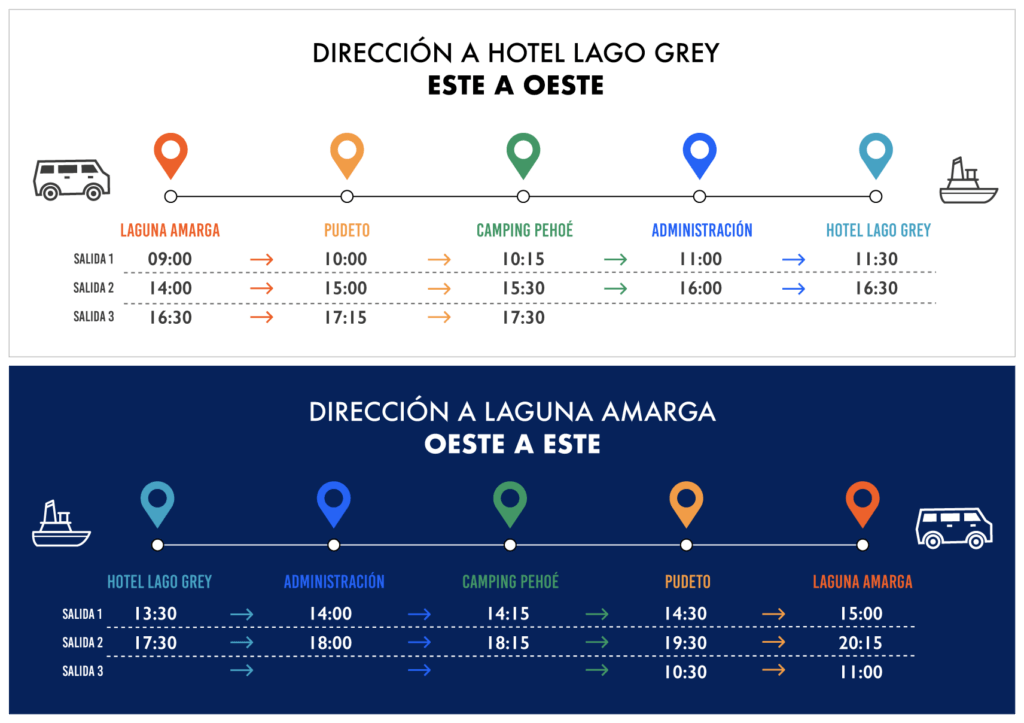 Desde Camping Pehoé: 14:15 y 17:45 hrs.